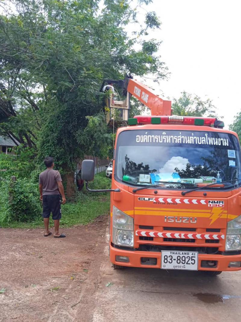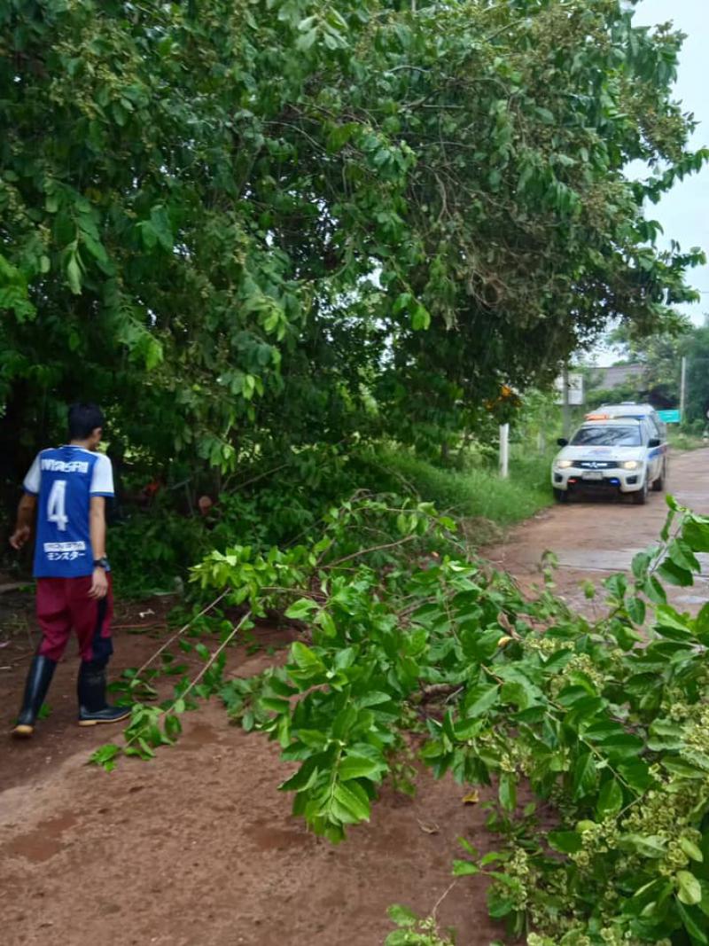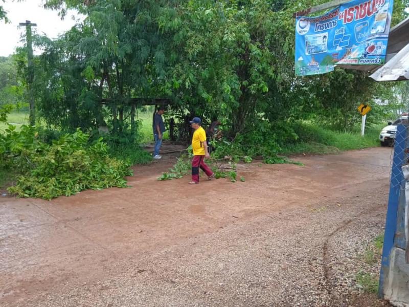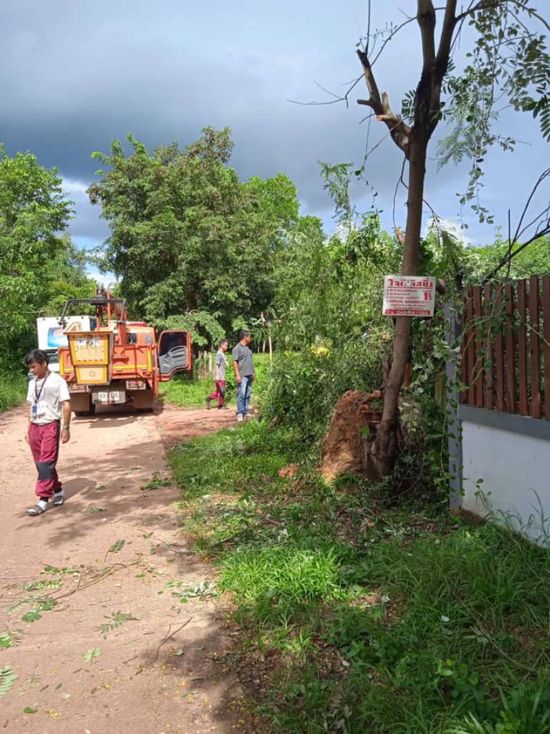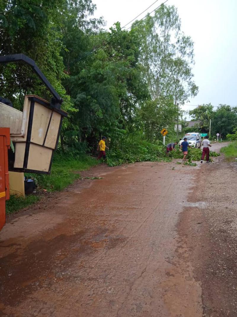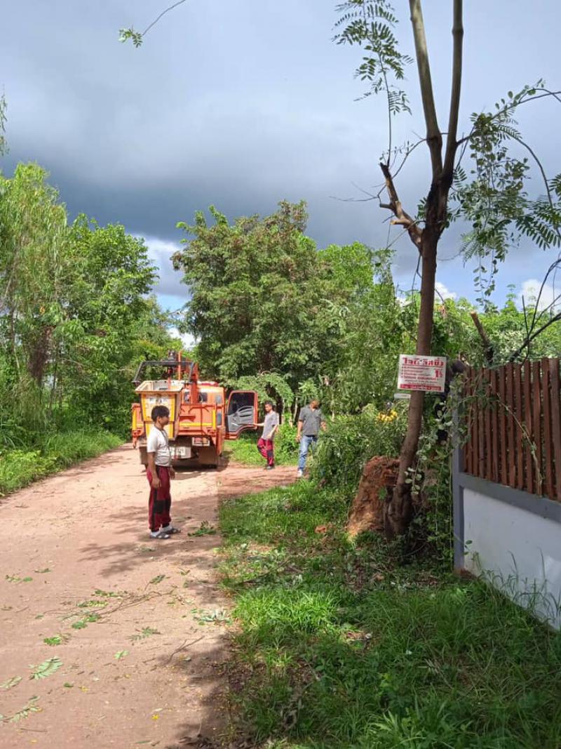 ตัดต้นไม้ที่ปกคลุมกีดขวางถนนและพาดผ่านสายไฟ ซึ่งก่อให้เกิดอัตรายตามถนน สายบ้านโพนงาม – บ้านศาลา (9 ภาพ)