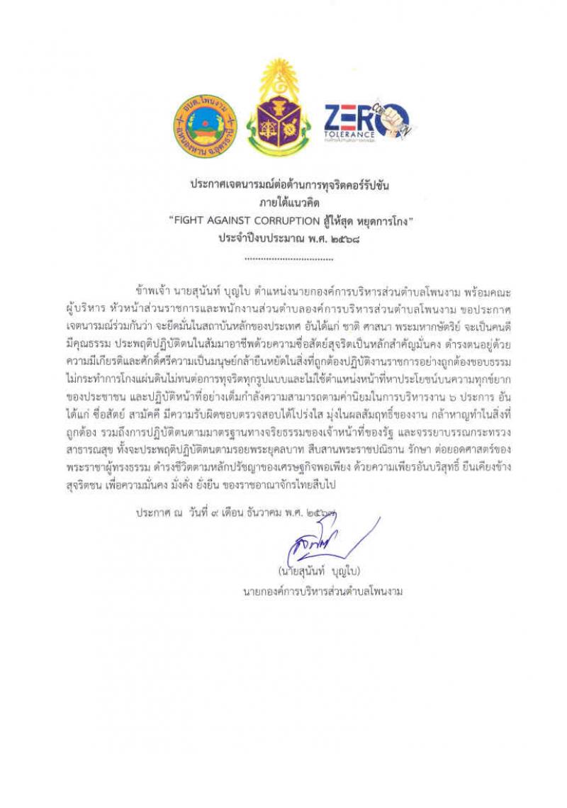 ประกาศเจตนารมณ์การต่อต้านการทุจริตคอรัปชั่นของผู้บริหาร ประจำปีงบประมาณ 2568