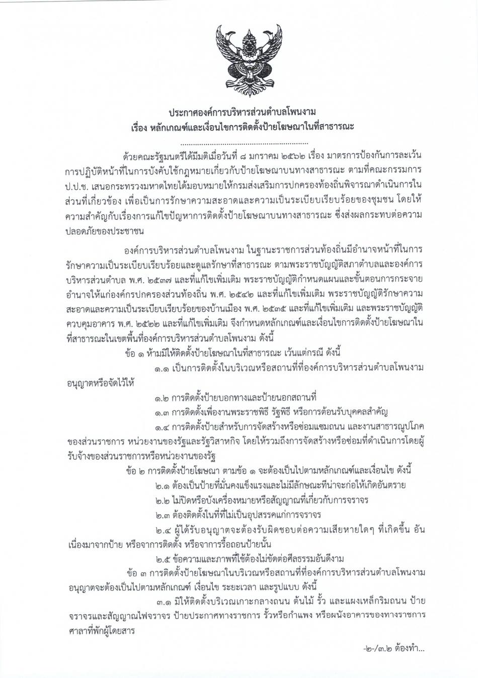 ประกาศองค์การบริหารส่วนตำบลโพนงาม เรื่อง หลักเกณฑ์และเงื่อนไขการติดตั้งป้ายโฆษณาในที่สาธารณะ [21 ตุลาคม 2567]