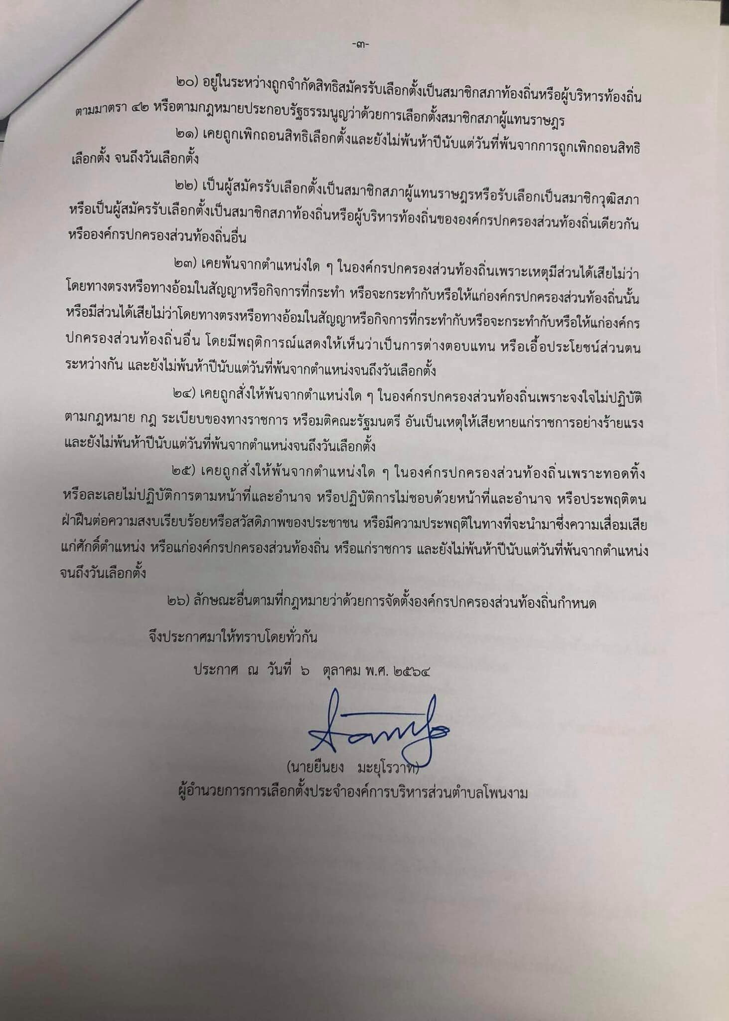 เรื่อง คุณสมบัติและลักษณะต้องห้ามของผู้สมัครรับเลือกตั้งสมาชิกสภา อบต. และ นายก อบต. โพนงาม