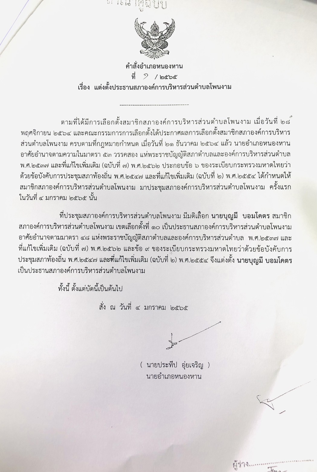 คำสั่งอำเภอหนองหาน เรื่อง แต่งตั้งประธานสภาองค์การบริหารส่วนตำบลโพนงาม