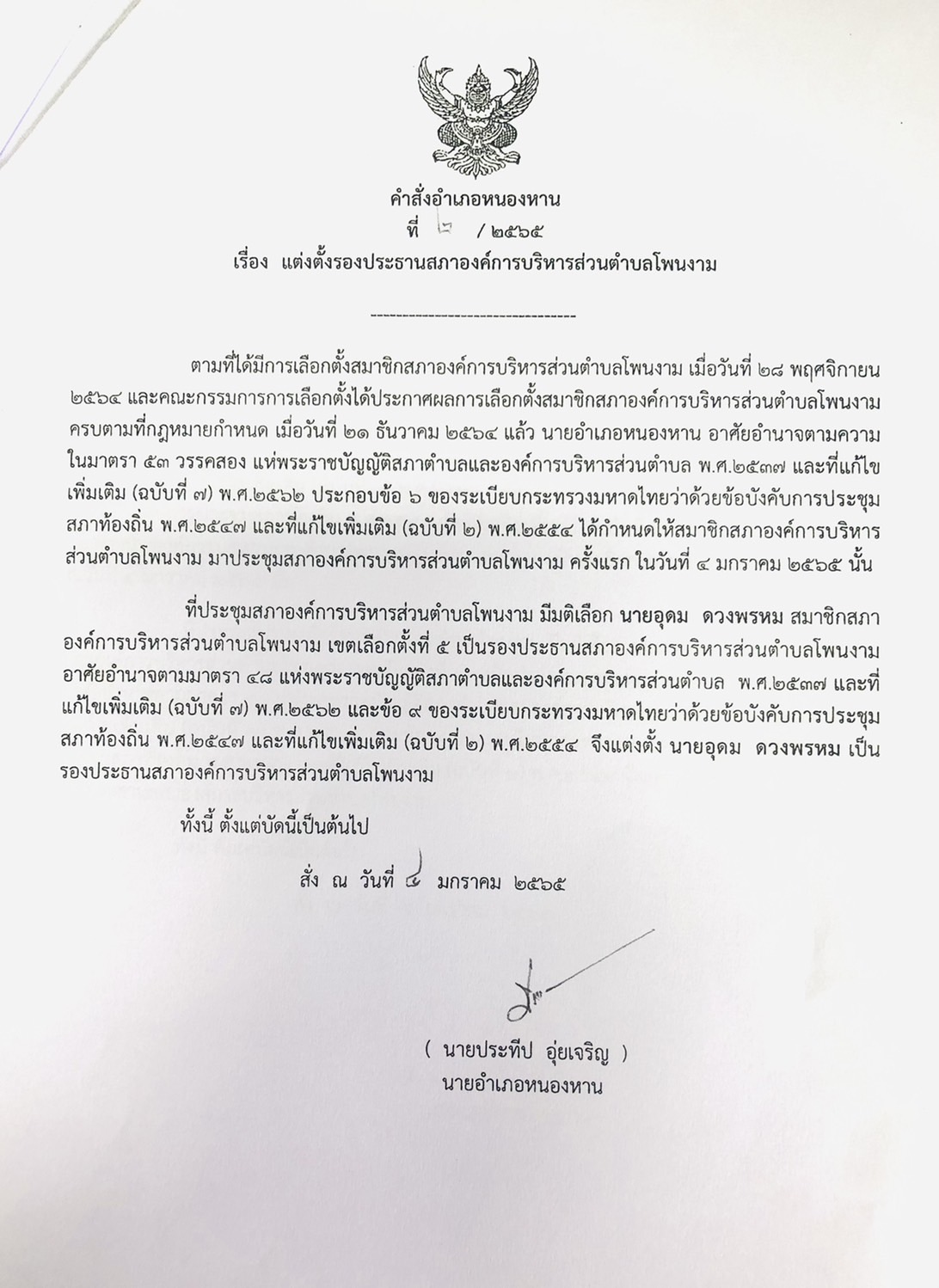 คำสั่งอำเภอหนองหาน เรื่อง แต่งตั้งรองประธานสภาองค์การบริหารส่วนตำบลโพนงาม