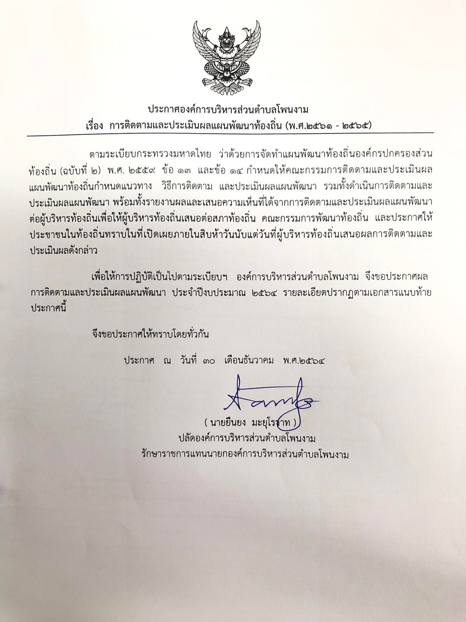 การติดตามและประเมินผลแผนพัฒนาท้องถิ่น(พ.ศ.2561-2565) ประจำปี 2564