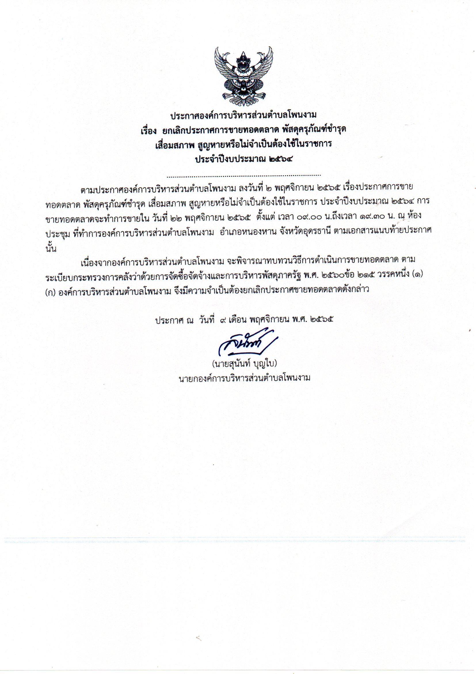 ประกาศองค์การบริหารส่วนตำบลโพนงาม เรื่อง ยกเลิกประกาศการขายทอดตลาด พัสดุครุภัณฑ์ชำรุด เสื่อมสภาพ สูญหายหรือไม่จำเป็นต้องใช้ในราชการ ประจำปีงบประมาณ 2564