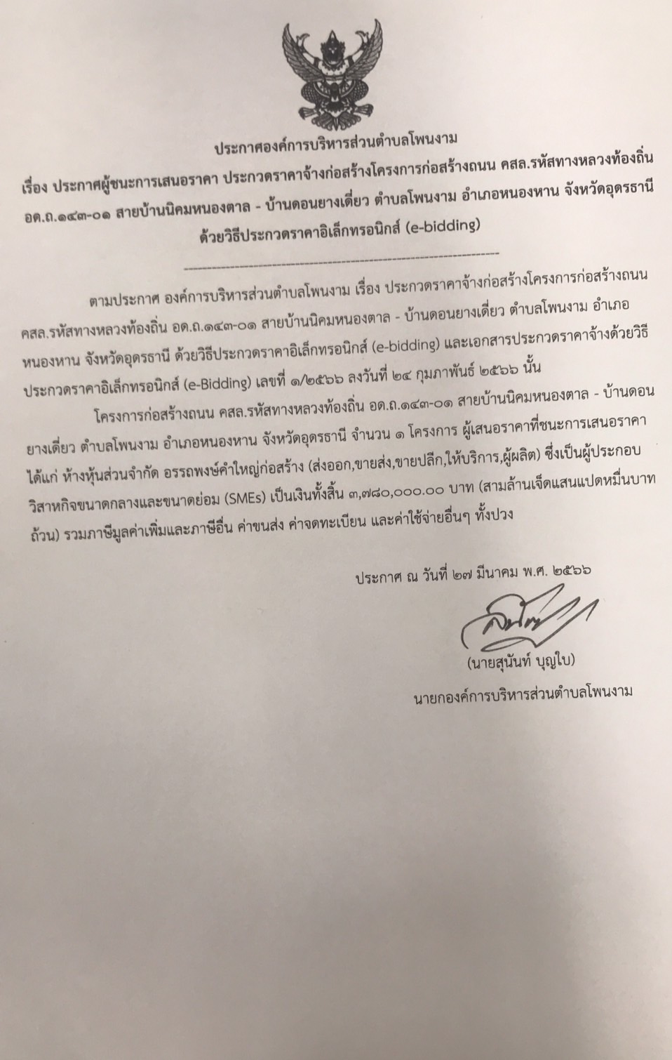 ชื่อเรื่อง : ประกาศผู้ชนะการเสนอราคา ประกวดราคาจ้างก่อสร้างโครงการก่อสร้างถนน คสล.รหัสทางหลวงท้องถิ่น อด.ถ.143-01 สายบ้านนิคมหนองตาล-บ้านดอนยางเดี่ยว ด้วยวิธีประกวดราคาอิเล็กทรอนิกส์ (e-bidding)